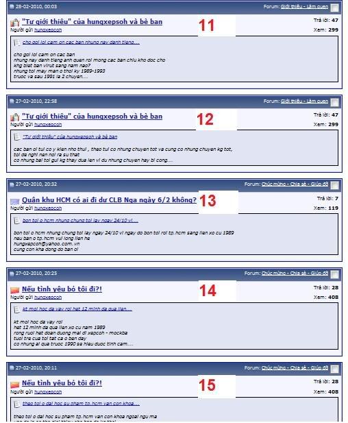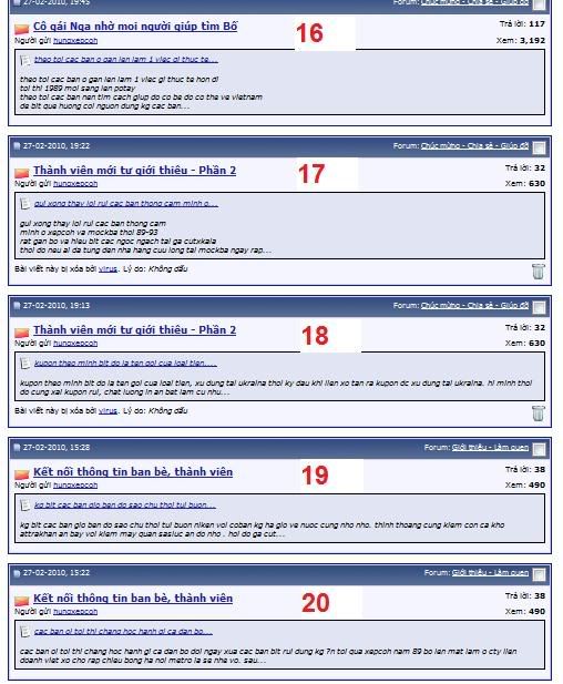 Bạn đã viết 17 bài trên diễn đàn NNN (kể cả bài viết trên), trong số đó có 2 bài bị xóa vì vi phạm nội quy diễn đàn (viết tiếng Việt không dấu). Vì vậy, chúng tôi không phục hồi các bài viết đó của bạn.