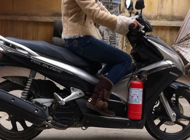 Em chỉ hơi băn khoăn: Không buộc thì chắc chắn để xe ở đâu đó bình chữa cháy dễ mất trộm. Mà buộc chặt như thế này nhỡ cháy thì có kịp gỡ ra mà dập lửa không?