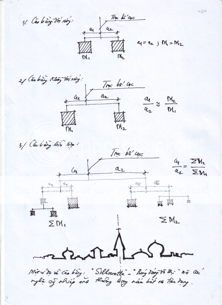 Sự bố cục các Điểm, Tuyến, Diện, Khối theo nguyên lý cân bằng (duy lý như cái cân tay - em sẽ minh họa sau) sẽ tạo cho hình (khối) được cân bằng và ổn định. Sự cân bằng do các yếu tố sau tạo thành: - Độ lớn, nhỏ của điểm, tuyến, diện. - Số lượng điểm, tuyến, diện. - Sắc độ (ảnh đen trắng là độ đậm, nhạt). - Hài hòa màu (bổ sung tam giác; chữ nhật hay tương phản (bổ túc)...) tạo được sự cân bằng. P/s: Các bác hay thấy các cơ quan công sở, các kts. nhà ta hay thiết kế đăng đối - đối xứng, thậm chí đối xứng một cách nghiêm ngặt. Em thì không ủng hộ cách suy nghĩ và cách làm việc như thế! Có lẽ do họ "lười biếng" suy nghĩ trong sáng tạo hoặc cũng có lẽ do khả năng đó là "trần". Những công trình cần có sự cân bằng đối xứng chỉ phù hợp cho Lăng tẩm, Đền đài, Tòa án, Chùa - chính điện... Còn những công trình khác, có lẽ theo hướng cân bằng bất đối xứng thì sẽ tạo được sự phong phú cũng như tính thẩm mỹ của các công trình kiến trúc, nhất là kiến trúc công sở.
