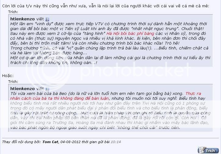 Tôi vừa xem bài của bà Beo (do là nữ và lớn tuổi hơn em nên tạm gọi bằng bà) xong. Thực ra nhân cách của bà ta thì không đáng để bàn luận, nhưng tôi muốn nói tới suy nghĩ: Biểu tình hay không biểu tình mà rất nhiều người nói tới hay như gần đây trên Tivi Hà Nội cũng có 1 phóng sự trong đó có mấy người dân phát biểu đại ý phản đối biểu tình và cho biểu tình là phản động, biểu tình là gây rối trật tự công cộng...Nực cười là hiến pháp VN còn ghi rõ Biểu tình là quyền của công dân, vậy thì cái Hiến pháp đó bản thân nó đã là phản động, đã là gây rối rồi còn gì. Còn nói : Có giỏi thì cầm súng ra Trường Sa, Hoàng Sa mà đánh nhau thì khác gì nhắm vào mấy bác lãnh đạo, vào bác phát ngôn Bộ ngoại giáo suốt ngày chỉ biết "không thể chối cãi" trước tiên.