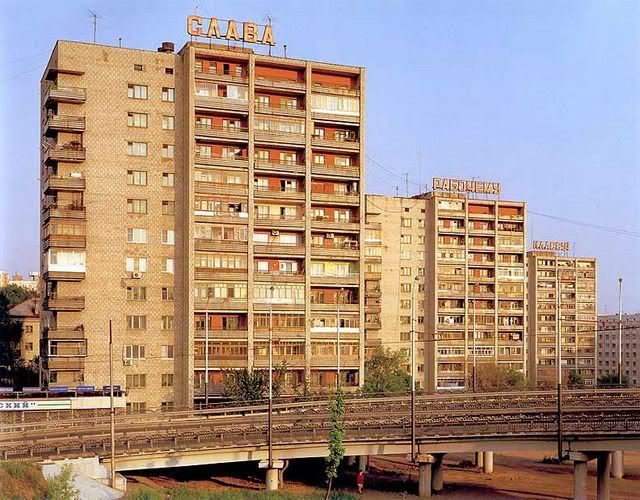 "Giai cấp công nhân vinh quang" hàng chữ được viết trên ba tòa nhà.