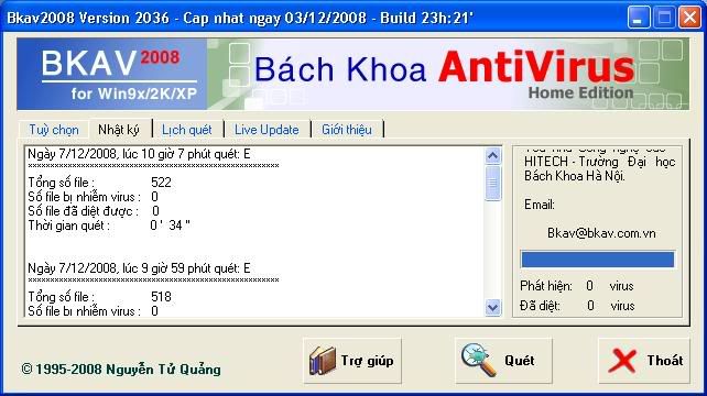Sử dụng Bkav Home Edition CSDL ngày 3/12/2008 và Kaspersky Internet Security 7.0 CSDL ngày 31/11/2008 (kém bkav 4 ngày) quét một usb 512 Mb
