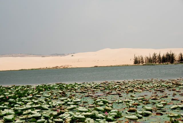 Tấm ảnh bác gọi là "Bàu Trắng", HM được nghe giới thiệu tên là "Bàu Sen" - vì ở đó có rất nhiều sen, hầu như quanh năm. Thiên nhiên và trời đất kỳ diệu đã ưu ái, ở giữa nhiều cây số đường cát bay với nắng và gió như hoang mạc, bỗng hiện ra 1 cái bàu nước trong xanh mênh mông ...