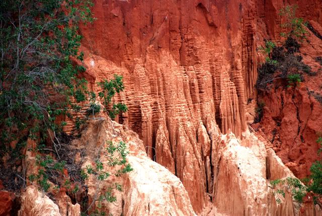 Cũng đơn giản thôi Cá Măng à, cát đỏ Phan Thiết là thành tạo địa chất cổ hơn so với cát trắng ven biển. Nó đã được cố kết để trở thành một loại "cát kết non", nghĩa là chưa rắn chắc lắm. Do vậy thành tạo này dễ bị nước mưa rửa trôi, "gặm nhấm", tạo muôn hình kỳ dị dọc theo mương xói (mà Geo gọi là dòng cháy tạm thời). Nhưng, những chỗ nào cát kết "già hơn", nghĩa là được cố kết chặt hơn, nó sẽ ít bị gặm mòn hơn, vì thế đôi khi tao nên những tháp đá rất ngoạn mục, trông như Tháp Chàm. Tuy nhiên, tuổi thọ của những tháp này không cao, có thể biến đổi hàng năm, và biến mât lúc nào không hay, do "đá cát" chưa thật sự rắn chắc, như cát kết Đồ Sơn chẳng hạn.