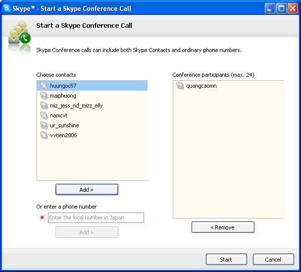 Nếu bạn muốn gọi điện 1 lúc cho nhiều người: Bạn ấn vào Conference vào add tất cả những nick mà bạn muốn gọi sang ô trống bên cạnh sau đó ấn Start và gọi được 1 lúc cho tất cả những người mà bạn đã chọn.