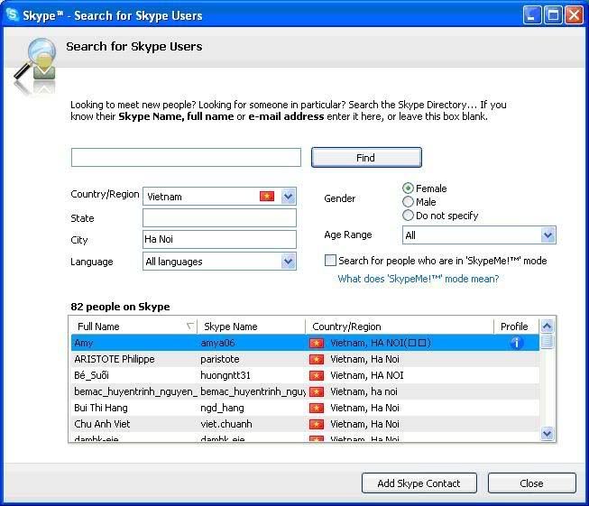 Để tìm kiếm nick 1 người nào đó bạn có thể ấn vào Search và khai báo vào các mục để dò tìm, sau khi tìm xong bạn chọn người đó và ấn vào mục add Skype Contact để add nick của người đó.