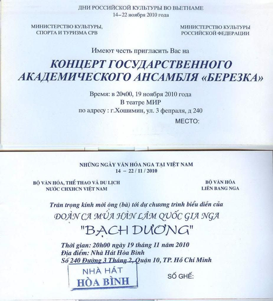 Ngày mai các bạn thử liên hệ Trung tâm Nga xin vé mời nhé. Chương trình biểu diễn của đoàn Bạch Dương không bán vé mà chỉ phát hành vé mời thôi. Mình đại diện bên Hội Doanh Nhân nên xin được số lượng vé mời như vậy. Rất tiếc là 50 vé mình xin được đã phân phát hết cho bạn bè mất rồi. Số lượng như vậy nhưng vẫn còn thiếu nhiều so với nhu cầu đấy.