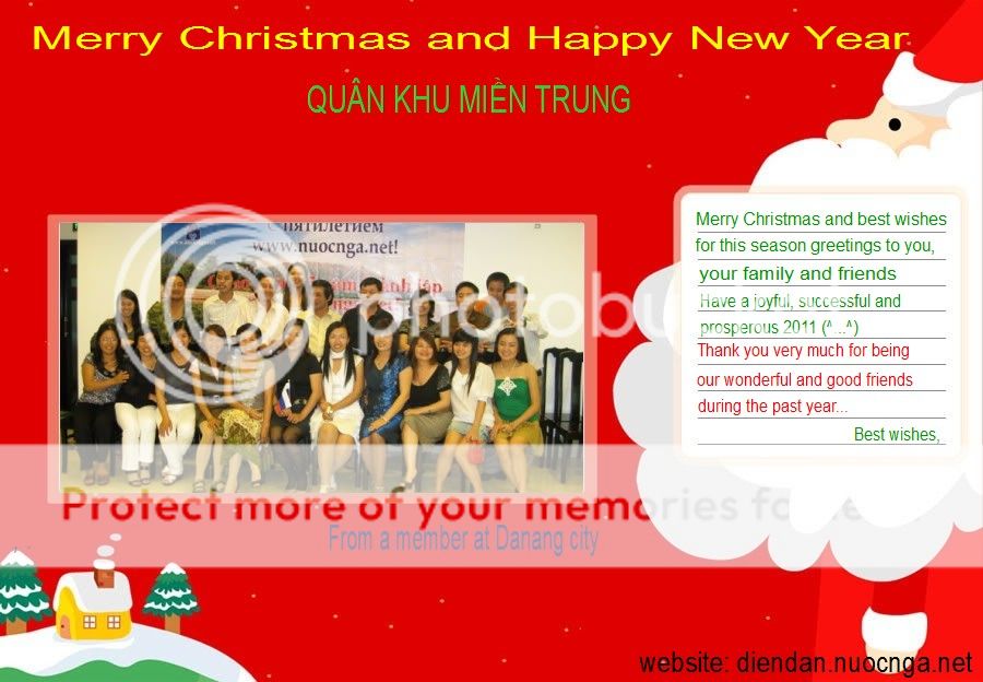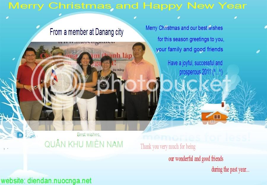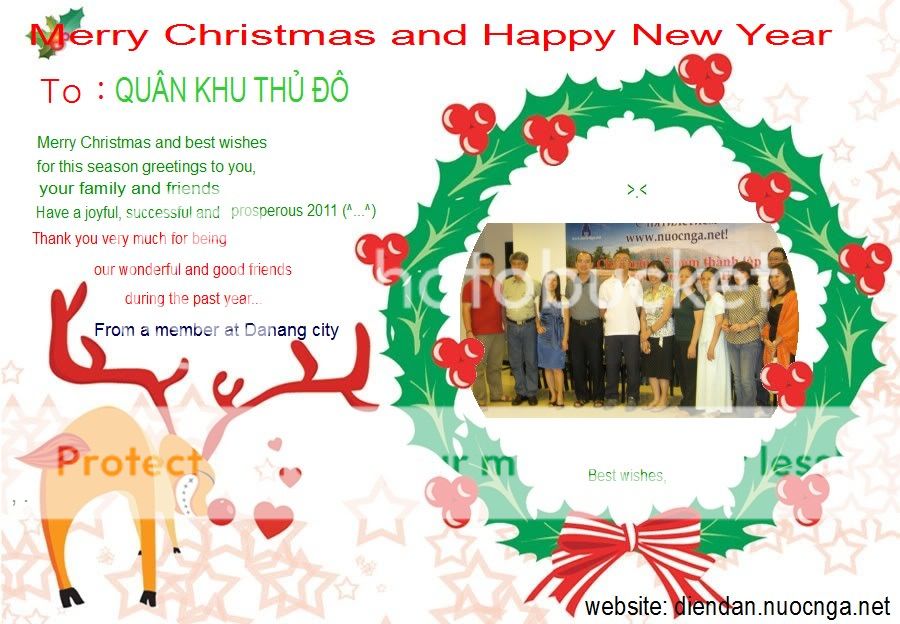 Lại sắp một năm trôi qua, nhìn lại 3N ngày sinh nhật 5 tuổi, thiệt mong sao nhanh đến dịp sinh nhật 6t, hi vọng 3N cả nước lại có dịp gặp gỡ, giao lưu, trò chuyện... Năm Tân Mão đang đến gần, chúc tất cả các thành viên của 3N một năm mới vui tươi và hạnh phúc Cind xin phép được gửi tới quân khu Đà Nẵng và quân khu ở hai đầu nỗi những lời chúc và tình cảm chân thành nhất... QK chủ nhà trong ngày sinh nhật 5 tuổi của NNN ![]() Và các thành viên của QK 2 miền đã không quản ngại đường xá xa xôi, gian lao vất vả đến với Đà Nẵng QK thủ đô ![]() Và QK miền Nam ![]() Đầu xuân năm mới chúc BÌNH AN, Chúc luôn TUỔI TRẺ chúc AN KHANG. Chúc sang năm mới nhiều TÀI LỘC, Công thành danh toại chúc VINH QUANG Merry Christmas and Happy New Year 2011^.^