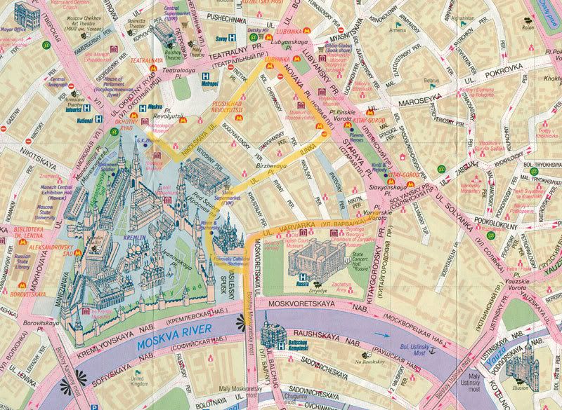 Ở đường phố Ilinka này có rất nhiều tòa nhà đẹp. phía bên phải chúng ta nhìn thấy khách sạn "Gostiniy Dvor" một tòa nhà dành cho những thương gia thăm viếng, nố được xây dựng vào năm 1790