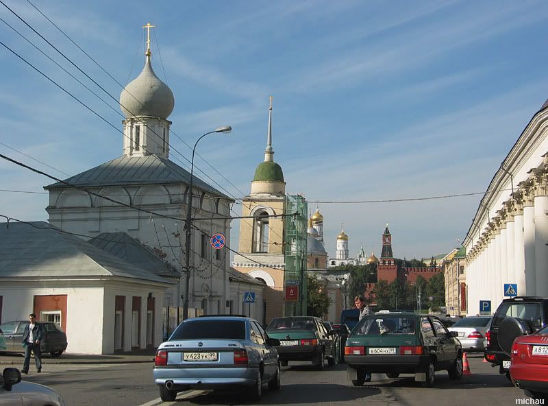 Chúng ta bắt đầu với đường phố Varvarka, một trong những đường phố siêu thực nhấtmà ta đã gặp. Phía trước bức tường của khách sạn Rossiya là một loạt nhà thờ nhỏ vẫn còn tồn tại