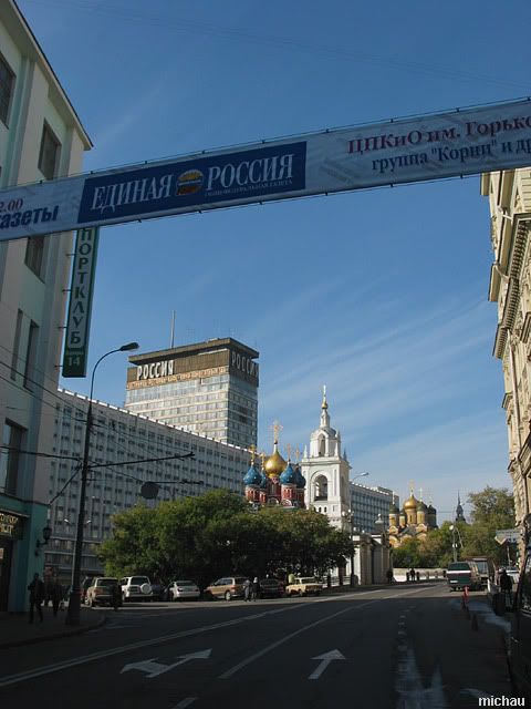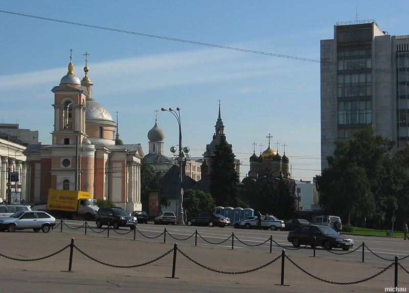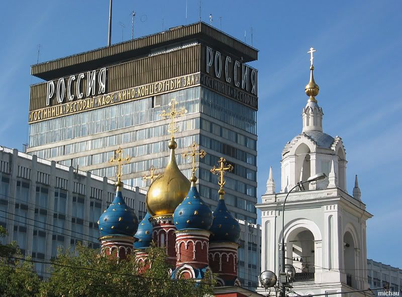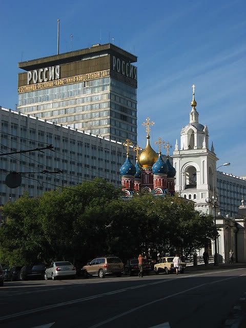 Nhìn từ phía sau những nhà thờ trên đường Varvarka và một góc phong cảnh của khách sạn Rossiya