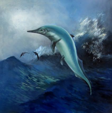 Geo gửi lên đây hình vẽ khôi phục con Thằn lằn cá (Ichthyosaurus) - cư dân biển trong Đại Trung Sinh, cùng thời với bọn Khủng Long. Con bò sát này thích nghi trở lại với đời sống trong nước đến nỗi nó là loại bò sát duy nhất sinh con ở dưới nước, không cần lên cạn đẻ trứng như Cá Sấu, Rùa biển v.v... Hình này do Geo vẽ, treo trên tường phòng làm việc của mình.
