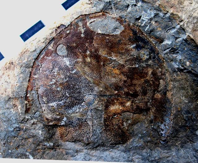 Khiên đầu con cá hóa thạch thuộc lớp Galeaspida do Geo tìm được ở Quản Bạ, Hà Giang. Con cá này có tuổi ngót nghét 400 triệu năm, thuộc kỷ Devon (ảnh Geo)