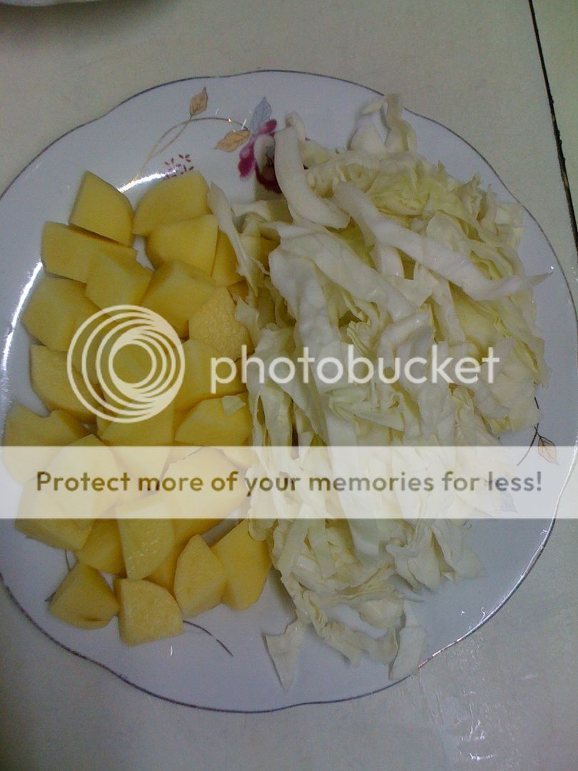 Khoai tây 3 củ vừa xắt cục vuông hơi to 1 tý, bắp cải khoảng 200gr xắt nhỏ cỡ 1cm.