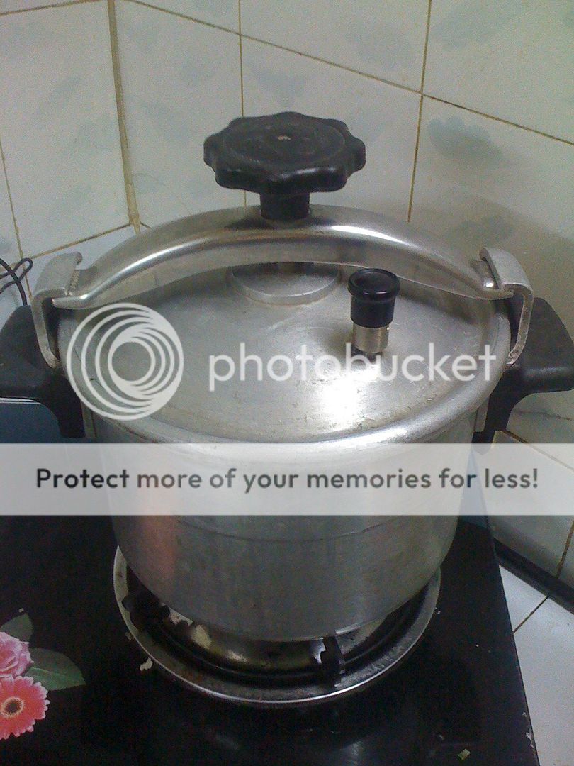 Xương ống, xương sườn già hay thịt heo đều được, em thì ngán thịt kiêng mỡ nên dùng sườn già. Nửa ký sườn già rửa sạch cho vô nồi áp suất, dùng nồi áp suất CCCP thì xương mau mềm hơn, (hehehehe, tin hay không tùy các bác) khoảng 1/2 giờ là được.