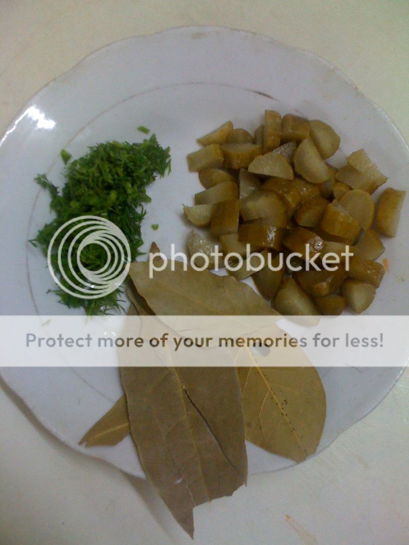 Dưa chuột muối vài trái xắt hột lựu to cỡ lóng tay út, thì là vài nhánh xắt nhỏ, lá nguyệt quế 4-5 lá.