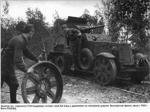 Binh sĩ củ hạ sĩ M.P. Andreev đang chuẩn bị xe BA-6ZhD để vận chuyển trên tuyến đường sắt. Mặt trận Volkhov, 8/1942