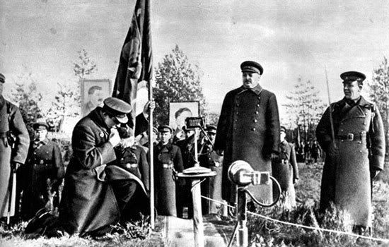 Bí thư ЦК ВКП(б) thành viên hội đồng quân sự của mặt trận Leningrad A A Zdanov đang giao phó lá cờ cận vệ cho một trong những cứ điểm của mặt trận (1942)