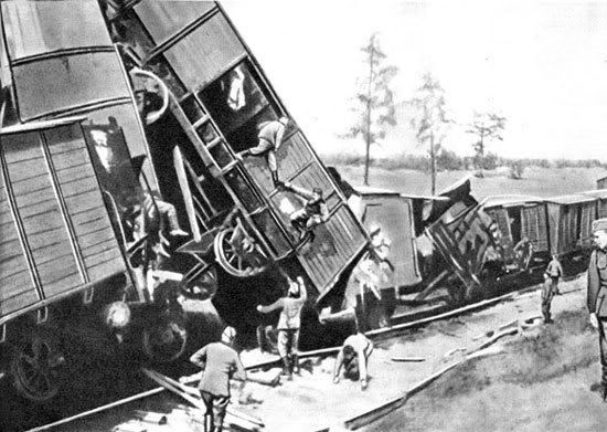 Эшелон с немецкими войсками, взорванный партизанами Ленинградской области (снимок найден у убитого немецкого офицера в 1942 г.)
