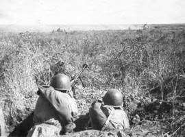 Đơn vị súng máy đang trong trận đánh. Ở cận ảnh – người huấn luyện y khoa đang cứu giúp người lính thương binh ( Mătk trận Leningrad, 6/1942)