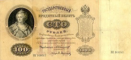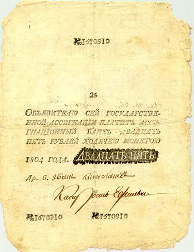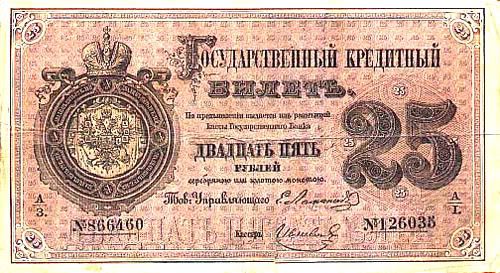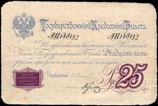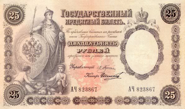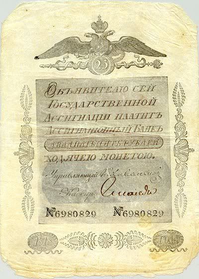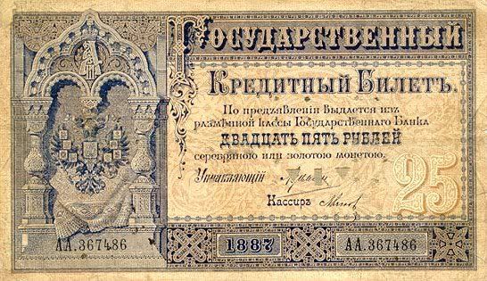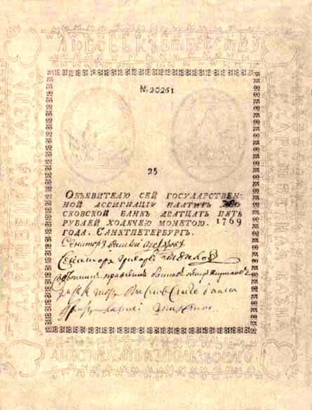 25 rúp. Được in vào năm 1769. Đây là tờ giấy bạc đầu tiên được phát hành tại Nga