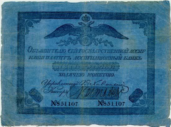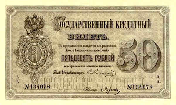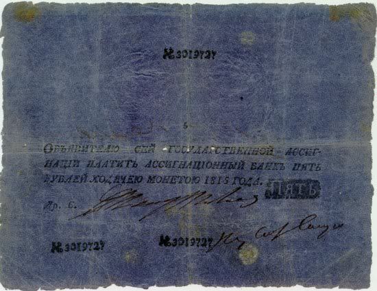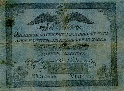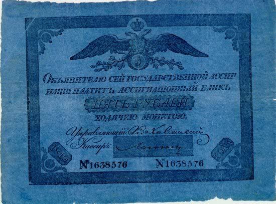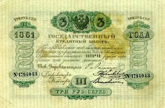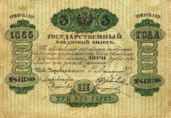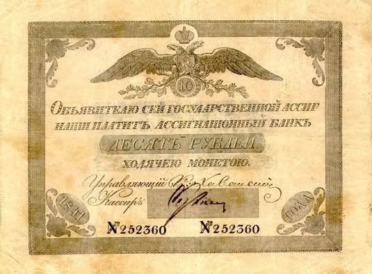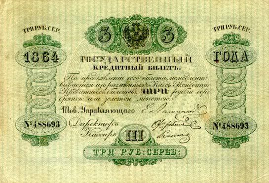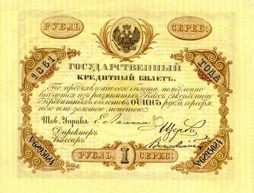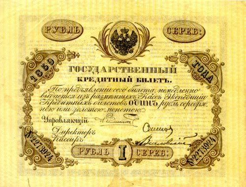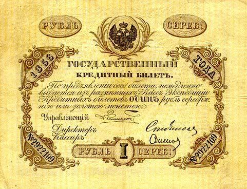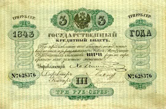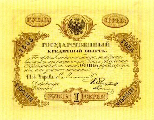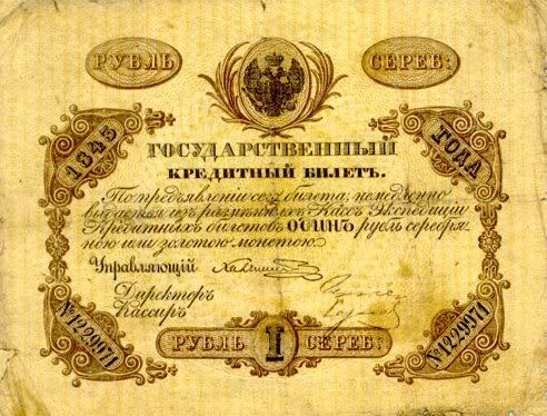 Năm 1843, giấy bạc đã sớm được thay thế. Với mệnh giá mới được ban hành này, cuối cùng thì cũng đã cân bằng được giá trị với đồng tiền bằng bạc. Nhưng, cuộc chiến tranh Crưm đã buộc phải in thêm nhiều tiền giấy và một lần nữa các mệnh giá đồng tiền giấy lại một lần nữa mất giá