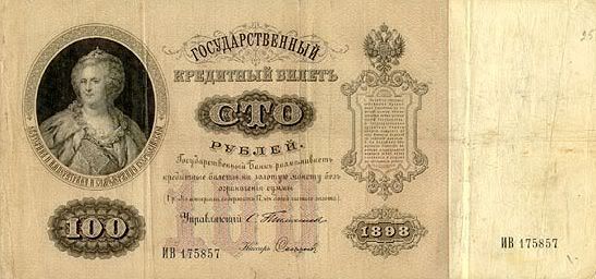 Tờ giấy bạc đầu tiên phát hành tại nước Nga được in vào năm 1769. Họ đã phát hành ra để thuận tiện trong các sự trao đổi tiền tệ, do nếu một số tiền lớn tiền đúc bằng kim loại thì rất khó khăn trong việc lưu giữ cũng vận chuyển. Nước Nga đã cho phát hành các tờ giấy bạc với các mệnh giá 25, 50, 75 và 100 rúp. Tuy nhiên, tờ 75 rúp đã nhanh chóng bị loại khỏi sự lưu hành tiền tệ do mệnh giá này bị làm giả quá nhiều, nguyên nhân là vì dân chúng đã cạo bỏ số "Hai" trên tờ mệnh giá 25 rúp để viết vào đó số "Bảy". Lần phát hành tiếp theo vào năm 1774, các tờ giấy bạc được in với kích thước nhỏ hơn và không phát hành tờ 75 rúp nữa